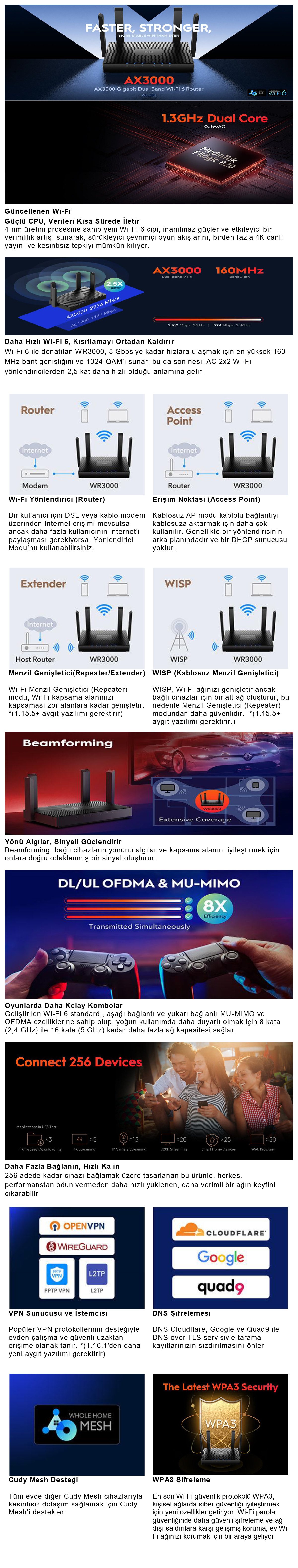 Cudy WR3000 AX3000 2.4GHz/5GHz 3000Mbps 4Port Gigabit Wi-Fi 6 Kablosuz Mesh Router