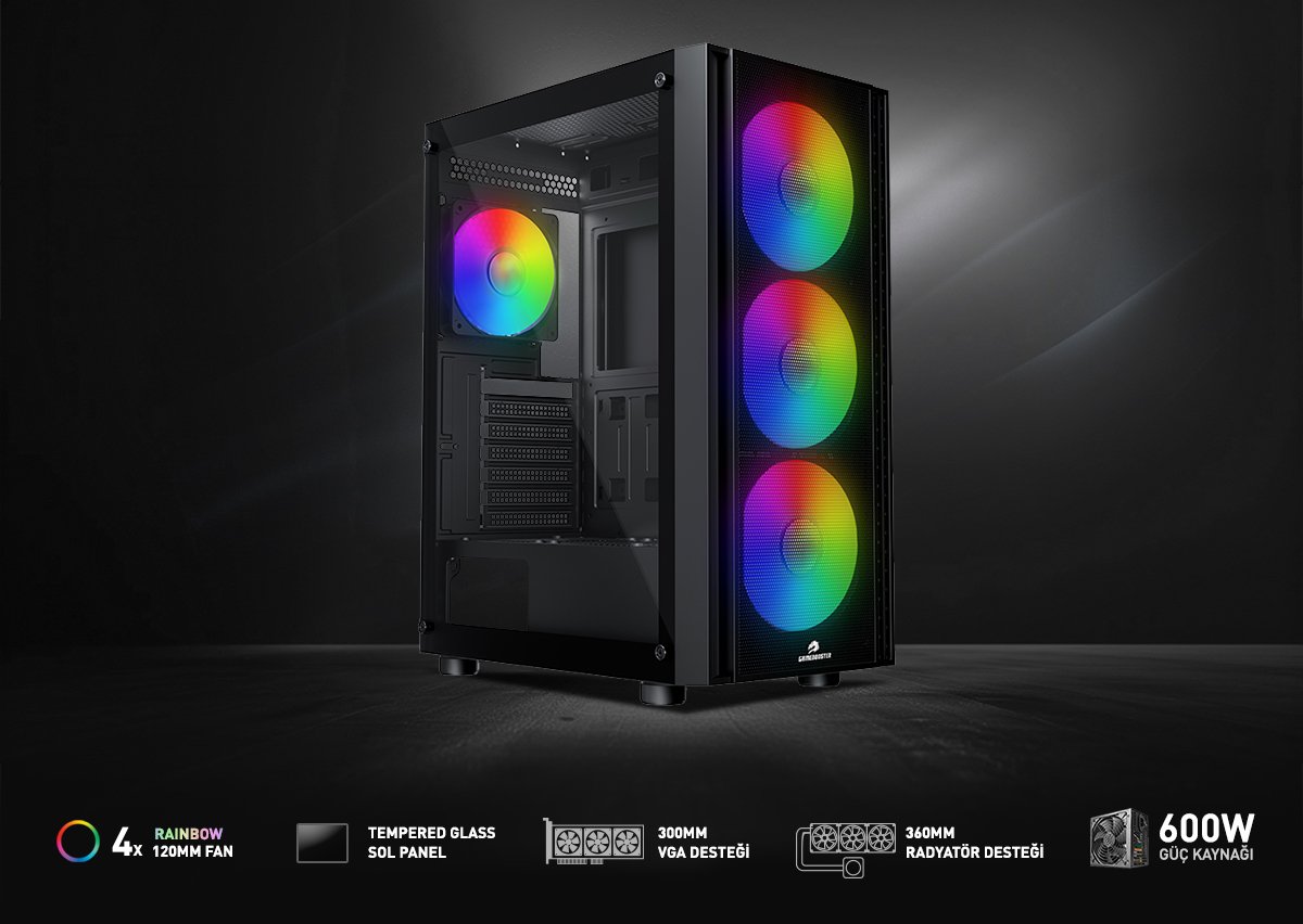 GameBooster CASTLE A651B 600W APFC USB 3.0 Mesh 4*Rainbow Fanlı Mid-T ATX Gaming Siyah Kasa
