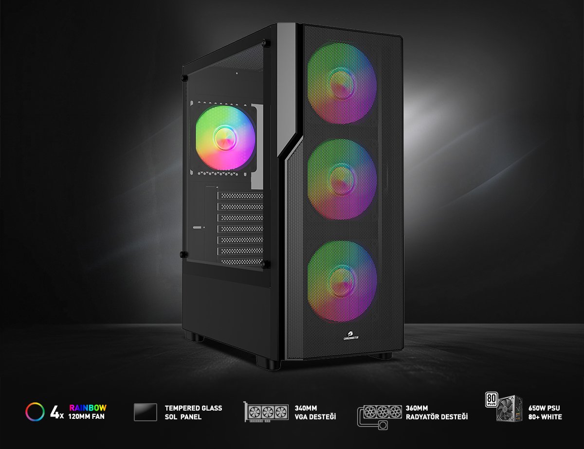 GameBooster CRUX E650B 650W 80+ WHITE USB 3.0 Mesh 4*Rainbow Fanlı Mid-T E-ATX Gaming Siyah Kasa