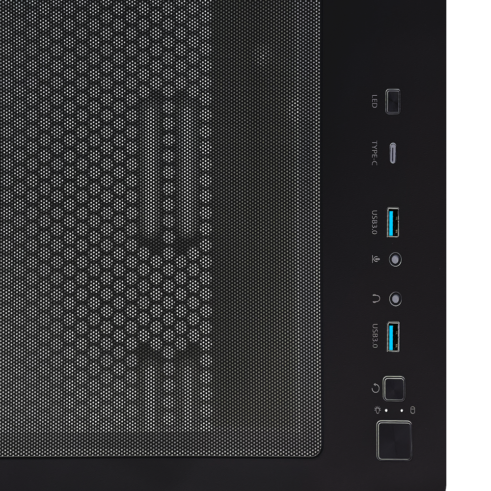 İhtiyaç duyduğunuzda en hızlı şekilde kolayca ulaşmanız için kasanın üst panelinde bulunan I/O panelinde aydınlatmayı ayarlayabilceğiniz LED tuşu, süper hızlı data transferi TYPE-C 3.1 yuvası ve 2 adet USB 3.0 portu, HD mikrofon ve kulaklık jakı mevcuttur.