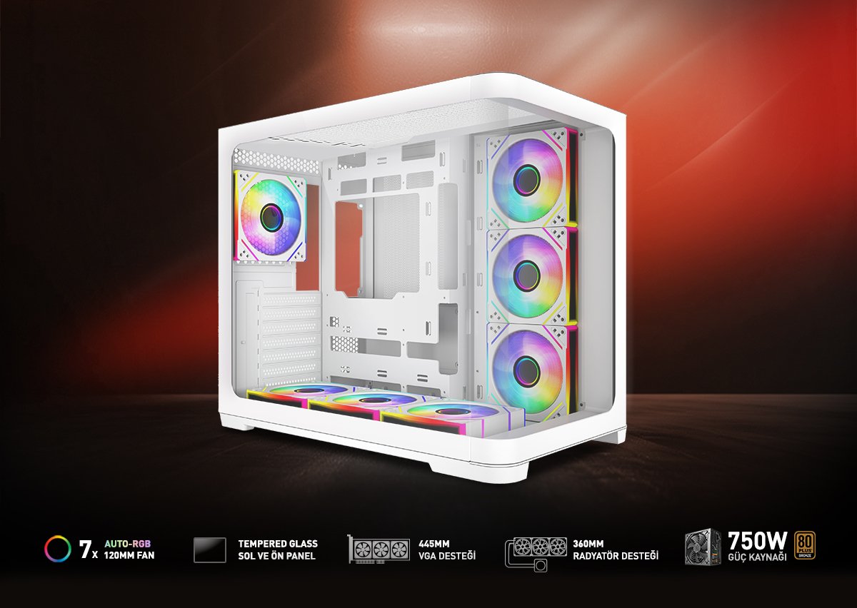 GameBooster G2852W, oyun odaklı sistemler için geliştirilmiş oyuncu kasasıdır. Şık tasarımı ve ARGB aydınlatmalı fanları ile göz kamaştıran olağanüstü görünüm sunar. Geniş iç hacmi ve üstün soğutma desteği ile hardcore sistemler kurmanıza olanak sağlar. Takılı olarak gelen 7 adet 120mm ARGB aydınlatmalı fanı ile olağanüstü soğutma sunar ve sistemin istikrarlı çalışmasını sağlar.