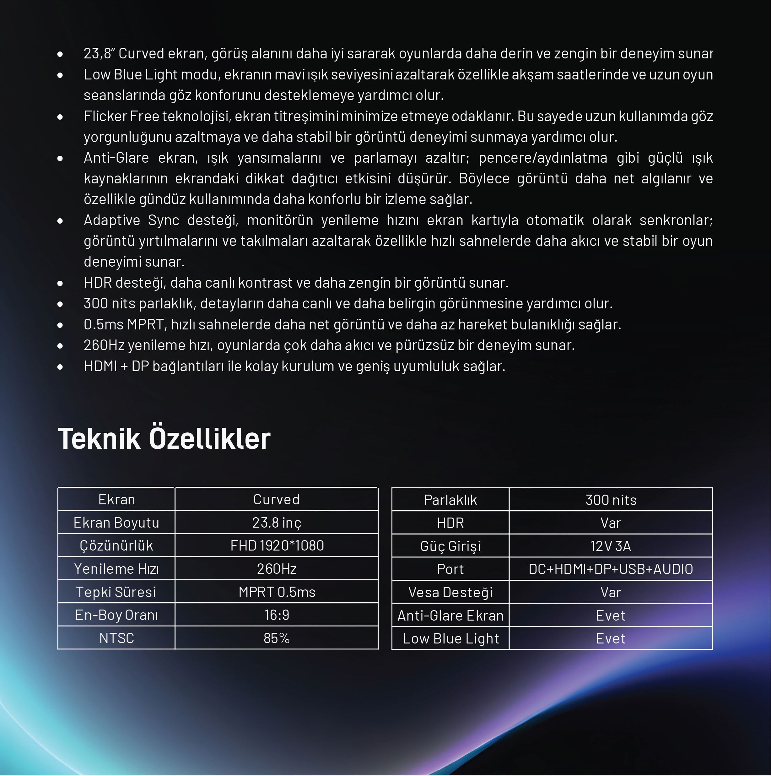 GameBooster Lyris EF26 23.8'' 260Hz 0.5ms FHD FAST VA Panel 3000R Curved Gaming Monitör