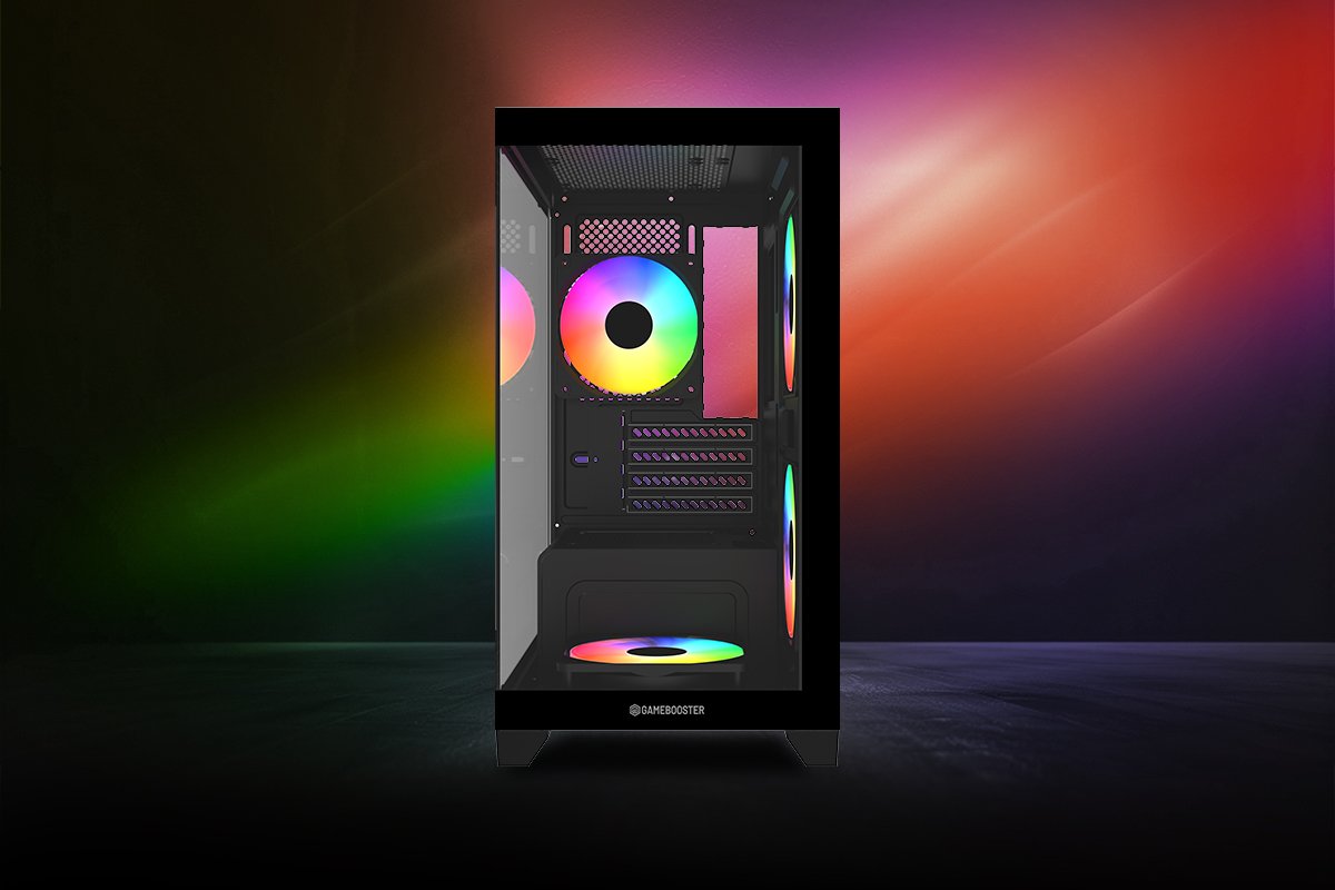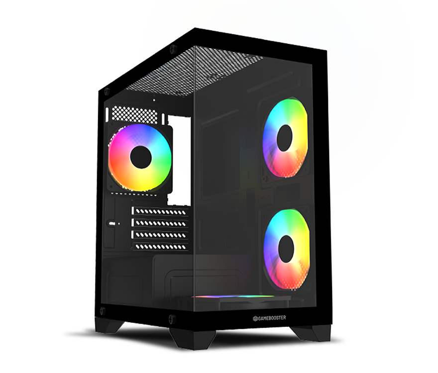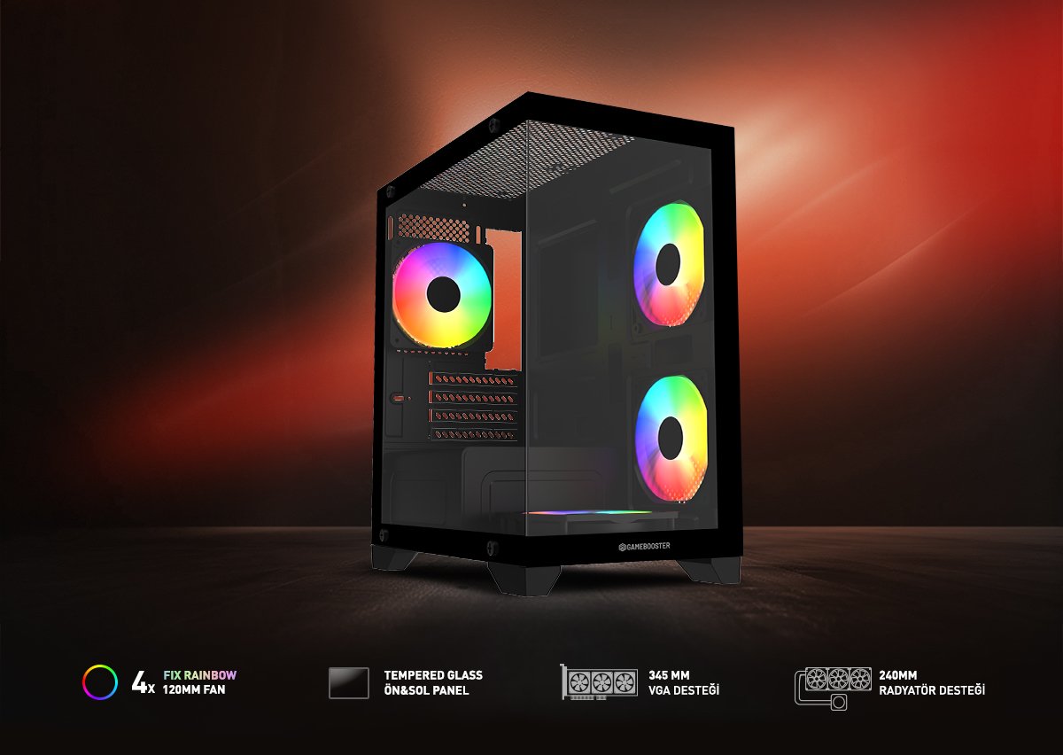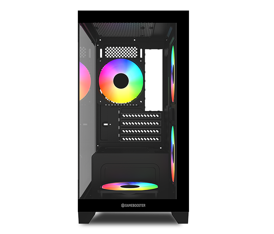 GameBooster M6001B, oyun odaklı sistemler için geliştirilmiş oyuncu kasasıdır. Şık tasarımı ve sabit rainbow aydınlatmalı fanları ile göz kamaştıran olağanüstü görünüm sunar. Geniş iç hacmi ve üstün soğutma desteği ile hardcore sistemler kurmanıza olanak sağlar. Takılı olarak gelen 4 adet 120mm sabit rainbow aydınlatmalı fanı ile olağanüstü soğutma sunar ve sistemin istikrarlı çalışmasını sağlar.