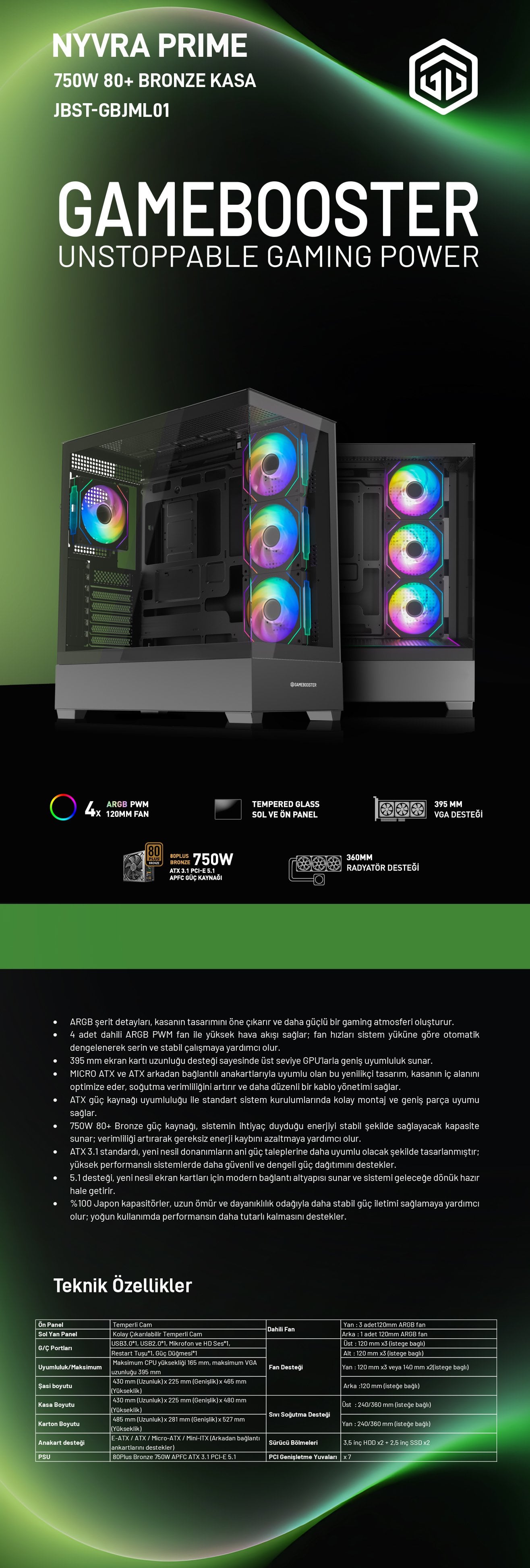 GameBooster NYVRA PRIME 750w 80+ Bronze APFC 3.1 PCI-E 5.1 4*ARGB PWM ARGB Şerit SeaView Gaming Kasa