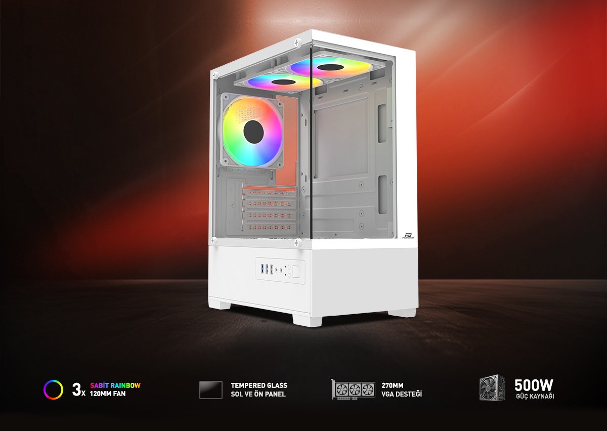 PowerBoost M5001W 500W 3*12cm Rainbow Fanlı USB 3.0 Seaview M-ATX Gaming Beyaz Kasa