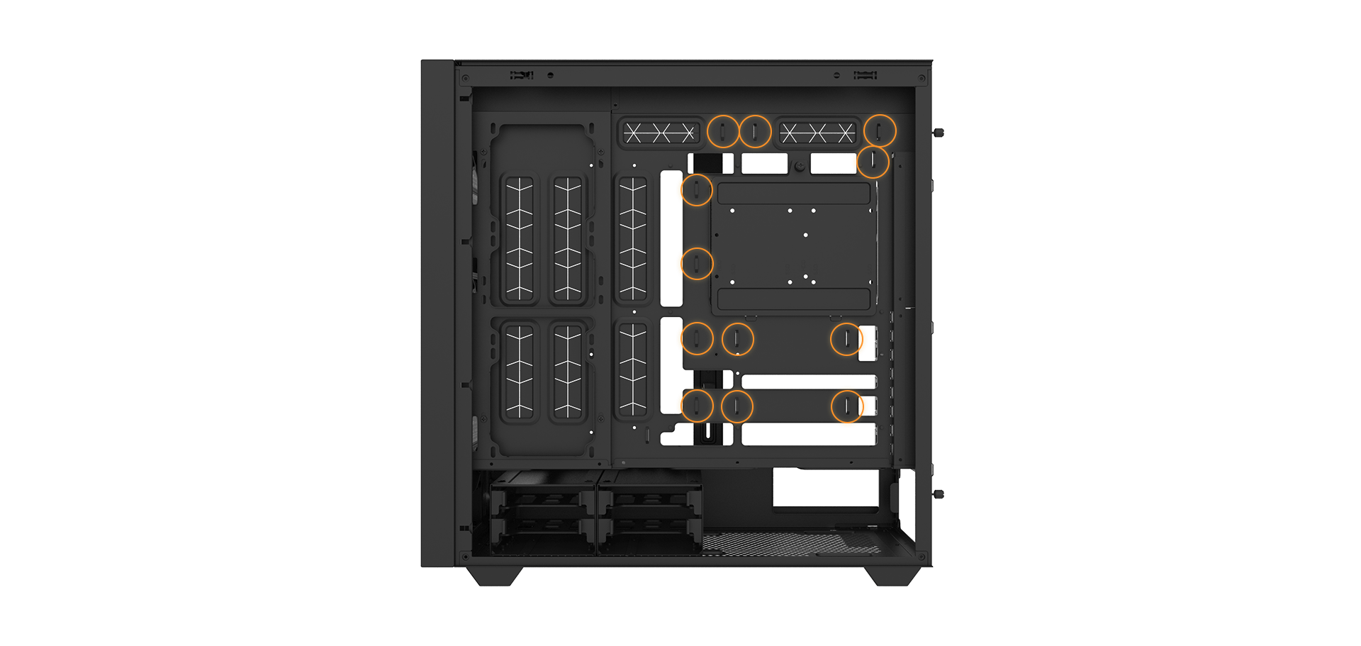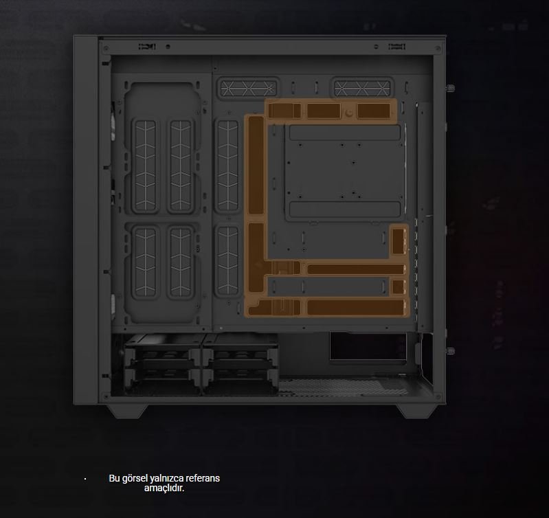 AX500 Full Tower Kasa, bir adede kadar E-ATX/EEB anakartı destekler ve anakart tepsisinde en yeni gizli bağlantı noktalı ATX ve micro-ATX anakartlar için kesikler bulunur.