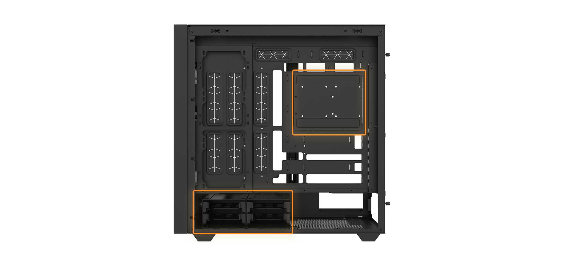 On dört adede kadar 120 mm veya dokuz adede kadar 140 mm fan takılabilir. Fan kapağı takılıyken bir adet E-ATX/EEB anakartı destekler; kapak çıkarıldığında ise üç adet 120 mm fan takılabilir.