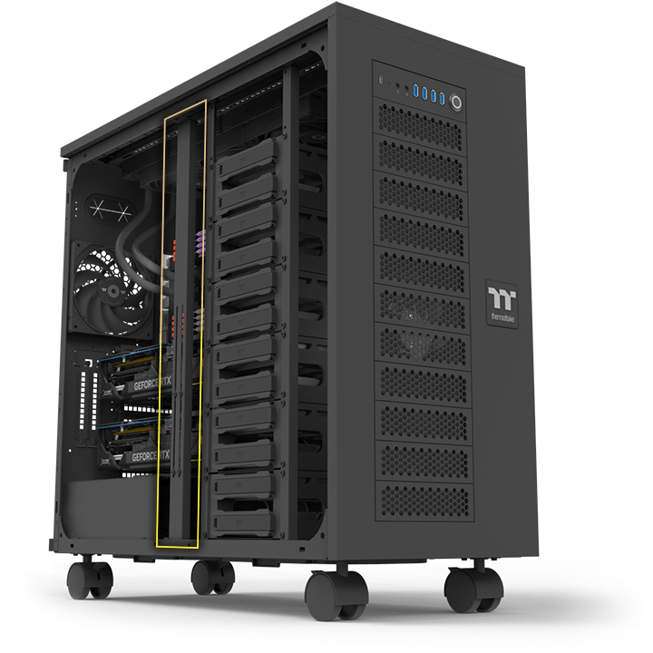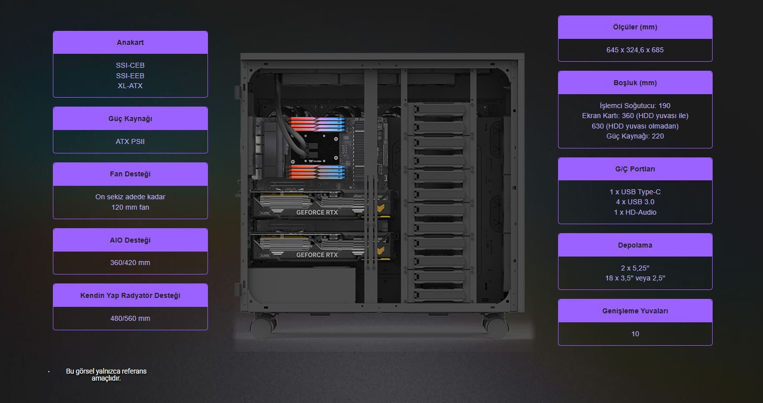 AX700 Süper Kule Kasası, içerik oluşturucular, oyuncular ve yapay zeka hesaplamaları için tasarlanmış, üstün performans, depolama ve soğutma sağlayan yüksek performanslı bir iş istasyonu süper kulesidir. Zorlu görevler için XL-ATX anakartları, beş ekran kartını ve on sekiz adede kadar sabit diski destekler. On sekiz fan ve büyük radyatörler için yer bulunan kasa, optimum hava akışı ve donanım ömrünü garanti eder.