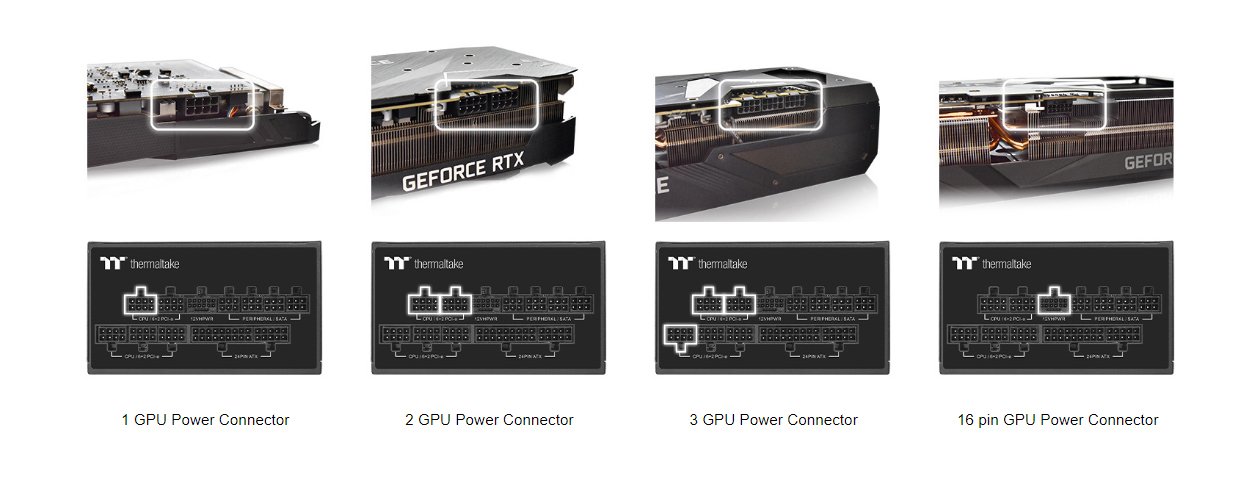 Toughpower PF3 serisi, PSU'nun yeni nesil GPU'ları yerel olarak çalıştırmasına olanak tanıyan güçlü ve istikrarlı bir performans sunmak için 16 pinli bir konektörle birlikte gelir. 12VHPWR'nin konektöründe işaretlenen watt değeri önerilen watt değeridir. (Ref. Intel tasarım kılavuzu) PF3 1050W'nin yerel 16 PIN'li (12VHPWR) PCIe konektörü, PCIe 5.0 grafik kartları için 600 W'a kadar güç sağlayabilir.