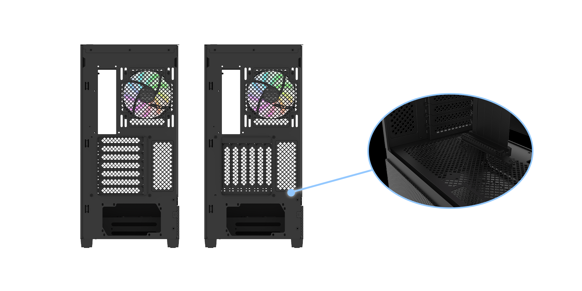 Döndürülebilir PCI-E yuvaları, yatay veya dikey GPU montajına olanak tanır ve özel destek alanı sayesinde 90 derecelik yükseltici kablo kurulumunu destekler.