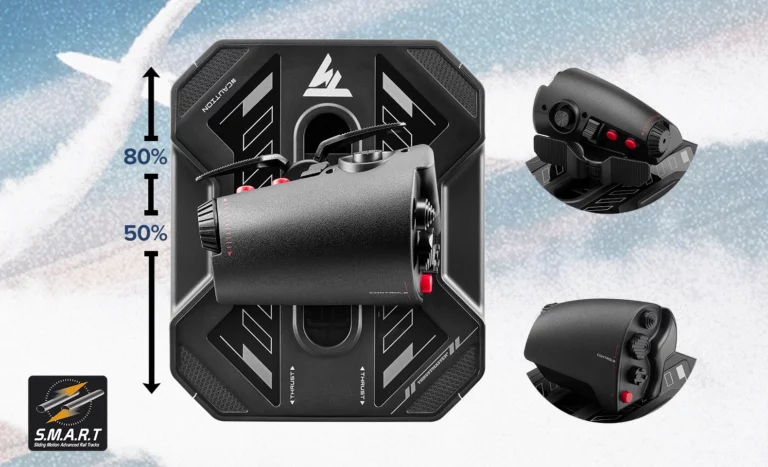 S.M.A.R.T. (Sliding Motion Advanced Rail Tracks) sistemi, 80 mm'lik hareket mesafesi boyunca akıcı, hassas ve konforlu bir hareket sağlar. Pilotluk ettiğiniz uçak tipine uyacak şekilde 4 kilit konumu yapılandırılabilir (hiçbiri; %50 veya %80 art yakıcı; çift kilit). Düğmeler, şapka anahtarları, başparmak tekerleği ve dümen, sol elinizle ek hareketler yapılandırmanıza olanak tanır.