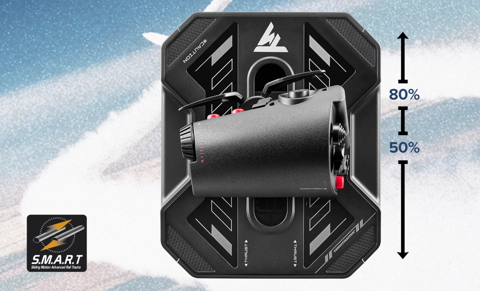 Motorlarınızın itiş gücünü optimize etmek için akıcı, hassas ve konforlu hareket sağlayan gelişmiş S.M.A.R.T. (Kayma Hareketi Gelişmiş Ray Rayları) teknolojisiyle 3,1 inç / 80 mm hareket mesafesinin keyfini çıkarın. Mandal, kullandığınız uçak tipine daha iyi uyum sağlaması için 4 konumda (hiçbiri; %50; %80 art yakıcı; çift mandal) yapılandırılabilir.